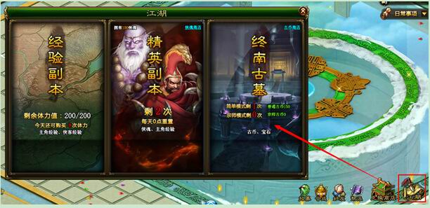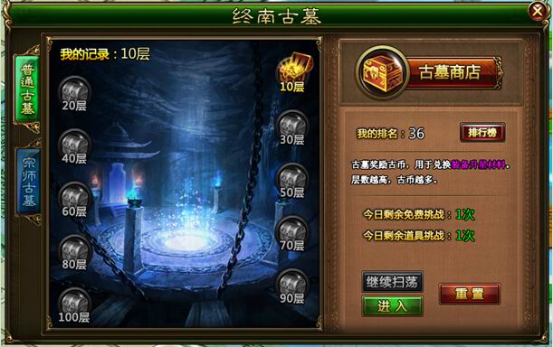 终南古墓共计100层,每层都有一位武艺高超的武林人士坐镇,只有将他们一一击败,才能进入古墓深处,打败他们中的强手,获得击败他们的证明——普通古币,换取人人垂涎的古墓秘宝。