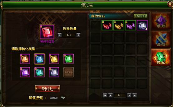 任意宝石,都能转化为同一级的其他宝石,最高只能转化8级宝石。宝石等级越高,所需的转化费用也越高。转化成功率为100%。