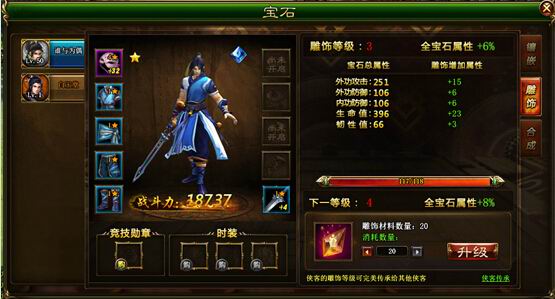 宝石雕饰,可用于提升主角和侠客的宝石雕饰等级,宝石雕饰等级越高,宝石属性加成越高,主角和侠客的宝石雕饰等级独立计算。
