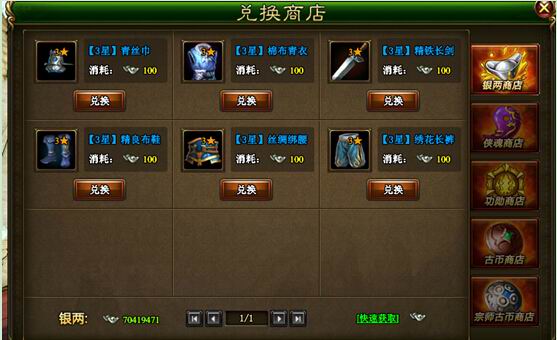 银两商店,可产出游戏初级主角和侠客最基础的装备,当获得一个新侠客时,为之配备上相应的装备,乃如虎添翼之举。