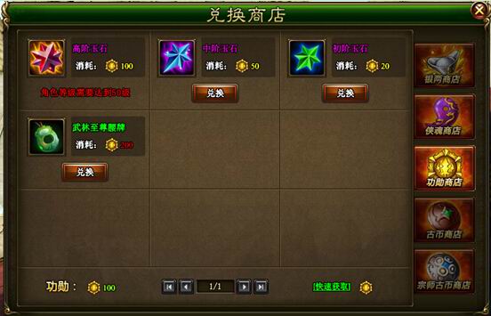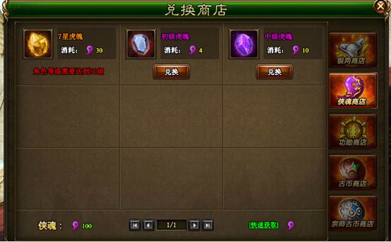 侠魂商店,可兑换人物升星所必须的各级虎魄,虎魄由精英副本可产出。