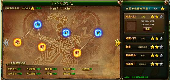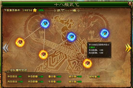 1. 30级开启“十八般武艺”系统 2. 十八般武艺系统有18幅武艺图,每张图有若干可激活节点 3. 每次激活节点需要消耗一定数量的副本评星,当评星不足时无法激活节点 4. 每激活一个节点获得指定属性 5. 某些特殊节点激活后开启新功能 6. 十八般武艺加成效果对所有出战角色均有效 7. 评星来自经验副本评星(精英副本评星不计算)