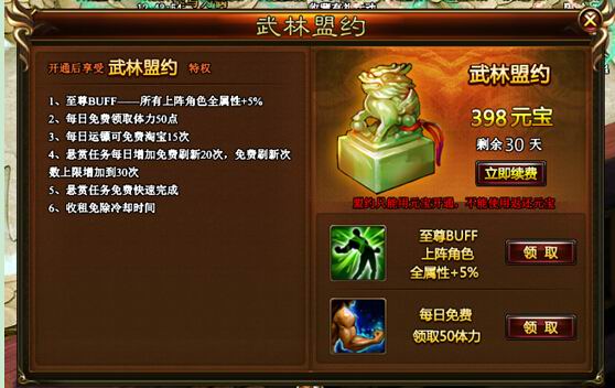 武林盟约,持续时间30天,在持续时间内拥有以下特权: