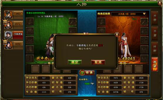 2)无损传承,两者属性取最高者。具体有:等级、星级、宝石雕饰、装备、心法、刷新技能。