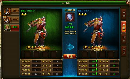 3)侠客星级不可超过主角星级。即当侠客星级与主角相同时,不能进行升星操作。