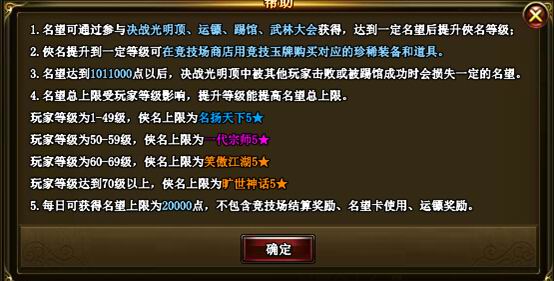 升级侠名,需要通过获得足够的名望来达成。以下为名望获取规则: