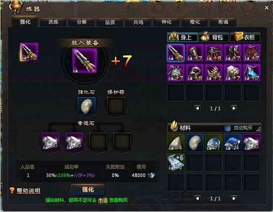 3.强化成功率:使用幸运石可以增加强化成功率,VIP有强化成功率加成,家族神炉和人品值也可以提升强化成功率,强化失败有附加成功率加成。