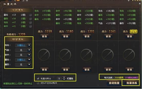 玩家可以通过批量洗炼按钮打开批量洗炼面板,在面板上勾选希望得到的属性,批量洗炼的次数,消耗一定数量的洗炼石以及银子对装备进行批量洗炼,直至洗出满意的属性为止。