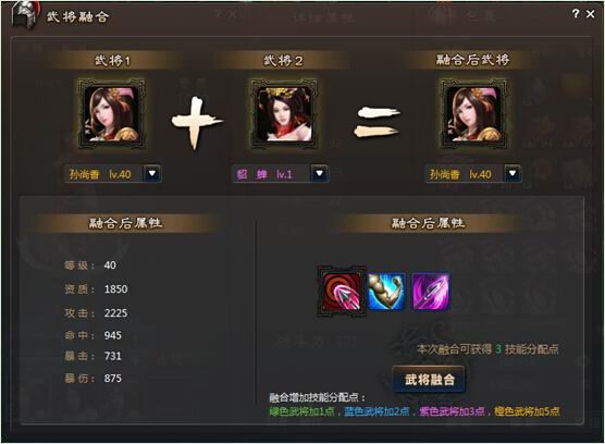 武将融合可以增加技能分配点,绿色武将增加1点,蓝色武将增加2点,紫色武将增加3点,橙色武将增加5点。玩家可自主选择融合后的武将形象.