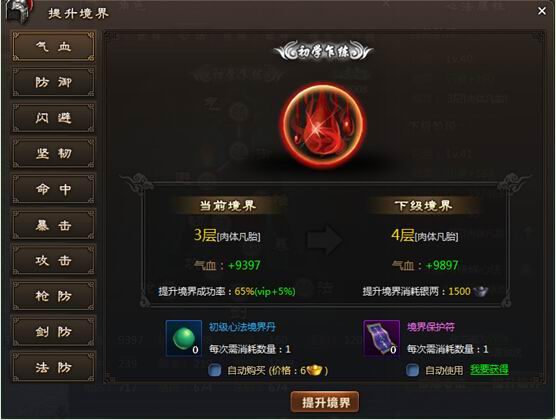 B.提升境界消耗心法境界丹和银两。使用境界保护符可保证提升境界失败不掉境界层级。心法境界丹可在商城购买,境界保护符在幸运探宝中获得。