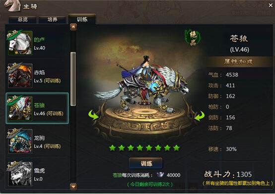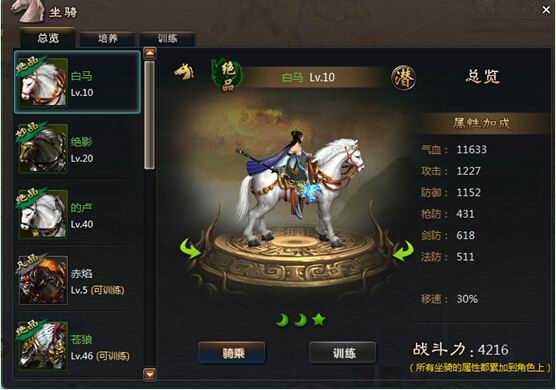 训练坐骑可提升坐骑的骑术经验,从而提升坐骑等级,等级越高坐骑属性越强。