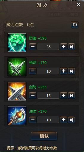 每激活一个御灵,可以获得坐骑潜力点,分配潜力点,可以增强坐骑的防御属性或者枪防、剑防、法防。