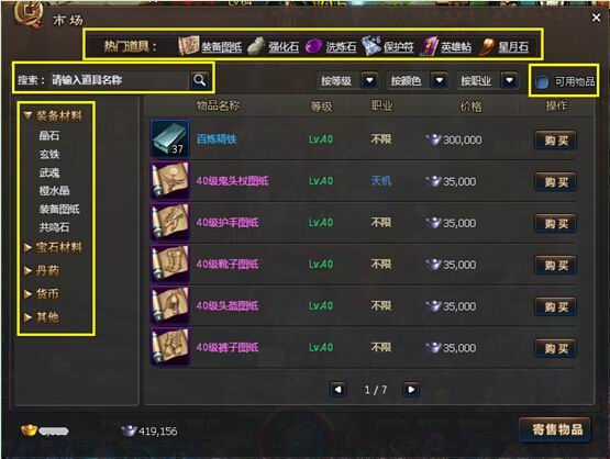 B.玩家可通过选择等级、颜色、职业等条件缩小搜索范围,快速找到自己想要的物品;