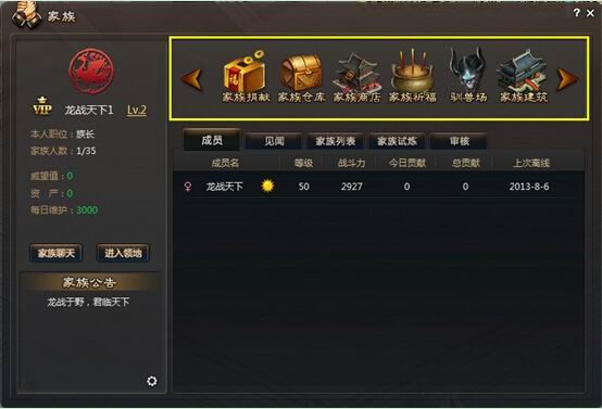 在龙战天下,玩家可以加入家族或者创建家族,与家族兄弟一起参加以家族为单位的家族战,保家卫国;在遭到侵袭的危难关头,向家族成员寻求帮助;在和平时期,与家族成员一同参加家族篝火,其乐无穷