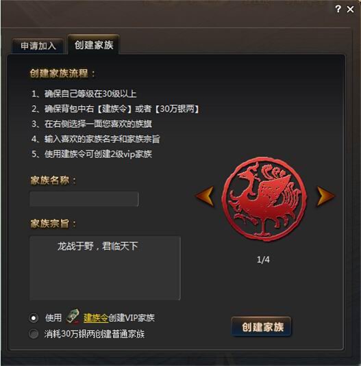 30级以上的玩家,使用30万银两可以创建普通家族;