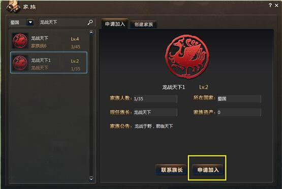 玩家已经创建的家族会出现在界面左侧,玩家点击【申请加入】,通过审核之后即可成为该家族成员。