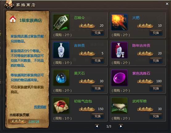 C.家族达到3级可开启家族商店,家族贡献可用于在家族商店兑换物品;