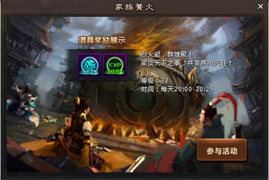 G.家族篝火每天20:00-20:25由系统自动开启,家族成员可以点击参与活动参与,在家族领地篝火附近可获得奖励;