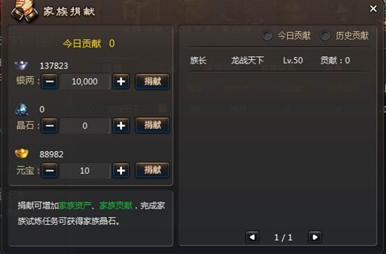 A.家族捐献:可捐献银两、晶石、元宝,捐献可增加家族资产和家族贡献;