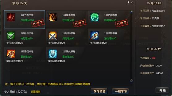 H.家族书院:学习书卷可获得各种buff加成,族长提升书卷等级可令本族成员获得更高属性;