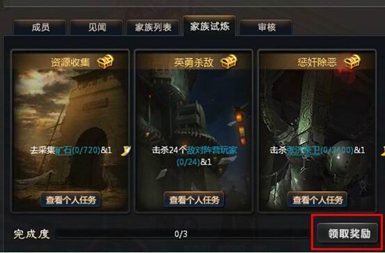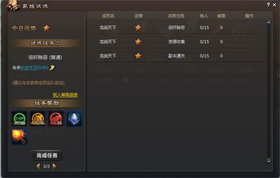 I.家族试炼:家族每天发布家族试炼任务,分个人任务和家族任务。个人任务品质可以请族员进行刷新,品质越高,获得奖励越多;家族成员齐心协力完成家族任务可以领取家族任务奖励。
