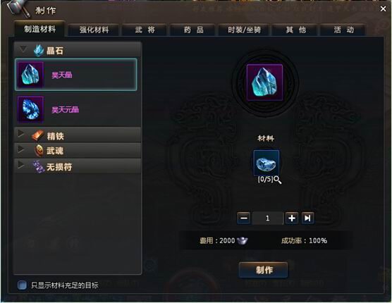 用于装备进阶的晶石和精铁、用于攻击类装备精炼的武魂、保护品质和强化无损的无损符均可在【制造材料】制作。