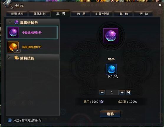 用于提升武将品阶的进阶丹以及提升武将战力的武将技能书都可以在【武将】制作。