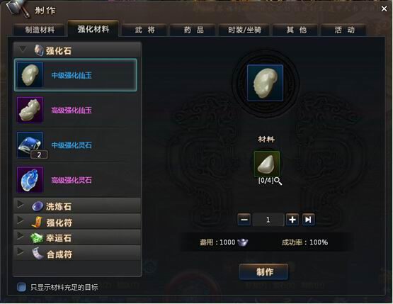 用于装备强化的强化仙玉和强化灵石、用于装备洗炼的洗炼石、用于保护强化不掉等级的强化保护符,用于增加装备强化成功率的幸运石以及用于合成高品质星月石的合成符均可在【强化材料】制作。