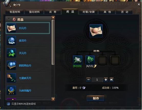 用于回复气血的气血药以及增加状态的状态药均可在【药品】中制作。