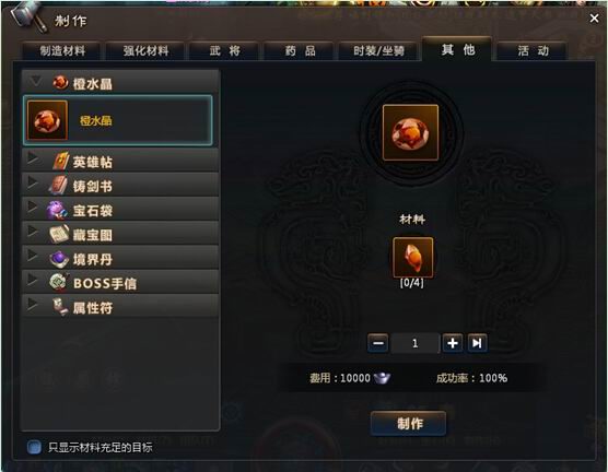 用于剑阁夺宝活动的铸剑书、宝石袋、英雄帖、boss手信均、提升心法境界的境界丹、精炼装备的橙水晶以及增加BUFF的属性符可在【其他】制作。