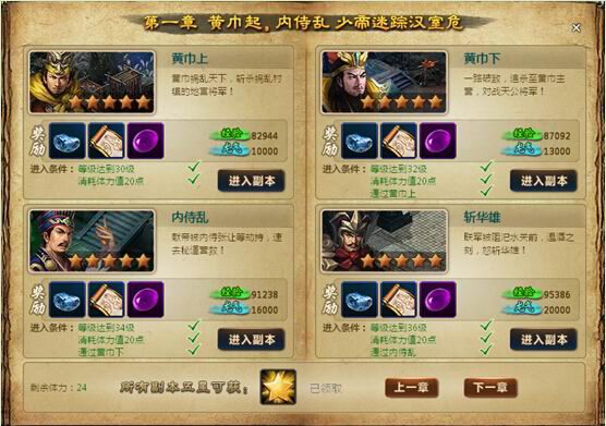 2.玩家角色达到30级可挑战第一个副本【黄巾上】,第一个副本通关之后,才可进入第二个副本,以此类推,越往后的副本,难度越高,通关获得的奖励越多。