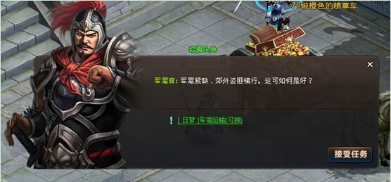 1.活动条件:等级达到32级可参加紧急军需活动,活动全天候开启,在洛阳NPC【军需官】处可接取任务