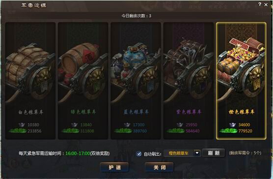 B.粮草车有白、绿、蓝、紫、橙五种颜色,护送此五种颜色的军需所获得的奖励依次提升;
