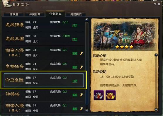 1.点击界面右上方【日常活动】-【任务副本】列表,即可打开皇陵守卫界面。