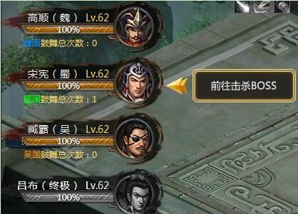 A.活动副本内共有4个boss,分别是高顺(魏)、宋宪(蜀)、臧霸(吴)、吕布(终极),各国玩家合力击杀本国boss后,方可挑战终极boss吕布。