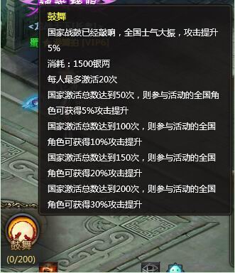 鼓舞:国家激活总层数达到200层,则参与活动的全国角色可以获得30%攻击提升,每人最多激活20次,每次消耗1500银两。