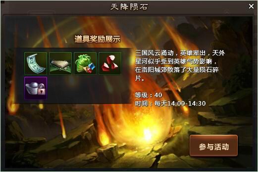 1.等级达到40级的玩家每天14:00-14:30可参与天降陨石活动,每天1次。活动开启时游戏界面右上方出现活动图标,点击打开即可传送至陨石降落点。