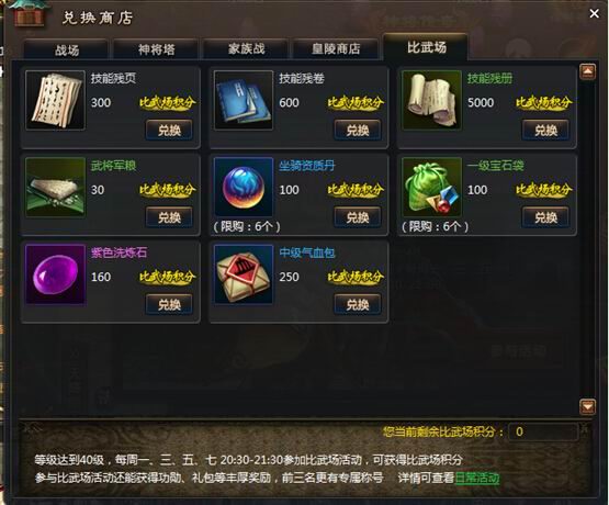 积分可用于在兑换商店兑换武将技能书、坐骑资质丹等珍贵道具。点击【角色】-【兑换】-【比武场商店】-【点击兑换】即可打开兑换商店。