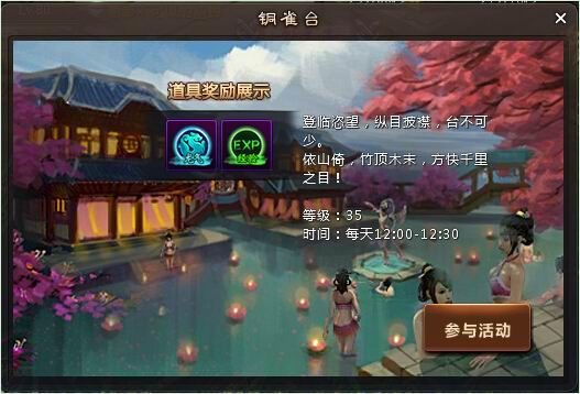 1.30级或以上的玩家每天12:00-12:30可以进入铜雀台。活动开启后点击界面右上方【铜雀台】图标或者活动提醒弹窗的参与活动可进入场景。