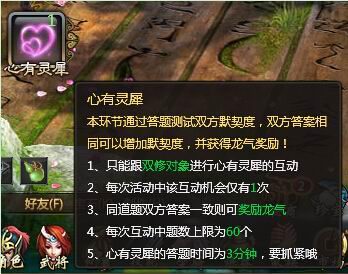 A.【青梅煮酒】活动中新增【心有灵犀】互动,测试双修对象的默契度,传递微妙情愫~(@^_^@)~注意只有双修对象才能测试哦。