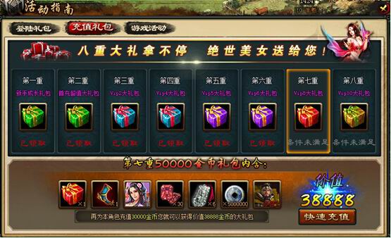 在活动期间内,无论充值多少金币,即可在“精彩活动”界面领取首充礼包一个,价值788元!领取后,在包裹中查看使用。
