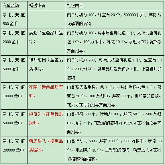 累计充值10000金币,即可获得:紫色将魂初始怒气*1、银币*200万、行动力*100、蓝宝石*30、鲜花*50、神符*200