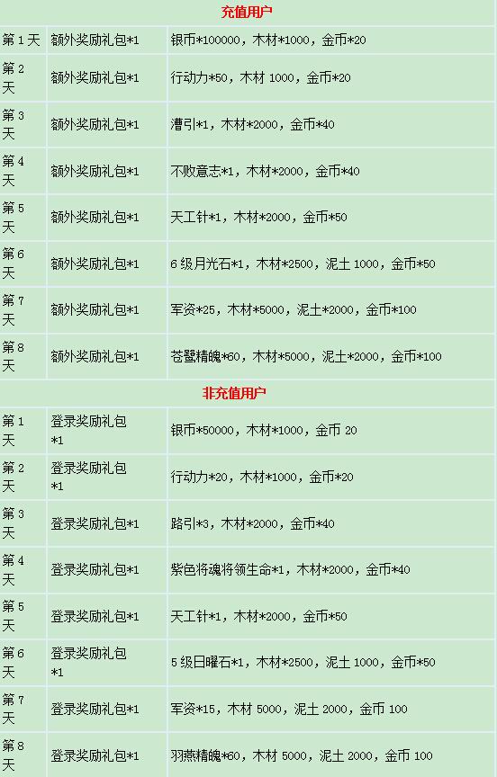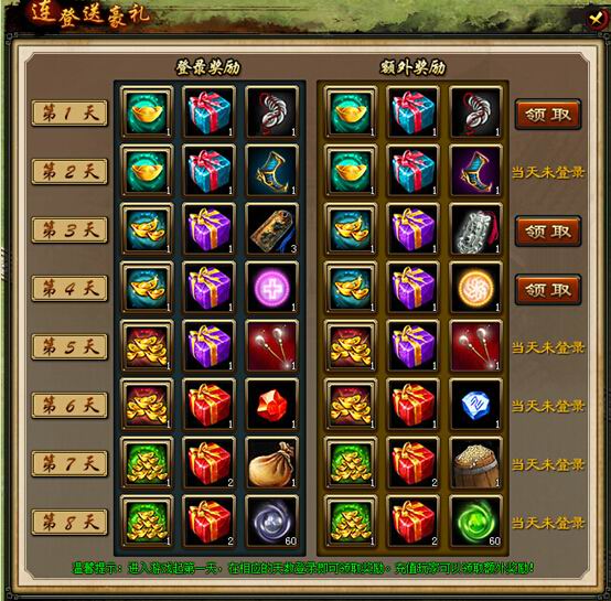 活动内容:在活动期间内,每天连续登录后即可在“八日连登”界面领取登陆礼包,领取后,在包裹中查看使用。充值玩家除了领取登录奖励外,还可以领取额外奖励。