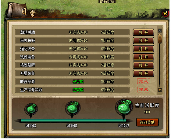 玩家完成相应的任务后,就可以获得活跃度,当活跃度到达一定的阶段,例如5、25、35等阶段,可以领取相关阶段的奖励,此外,VIP能够领取更多的活跃的奖励。