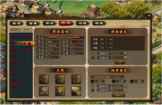 武将的培养可以大幅度提高武将的属性,根据消耗的东西不同,培养可以分为普通和加强培养,在该界面的下方,有一个批量培养,在这里玩家可以勾选想要培养的属性来对武将进行培养。