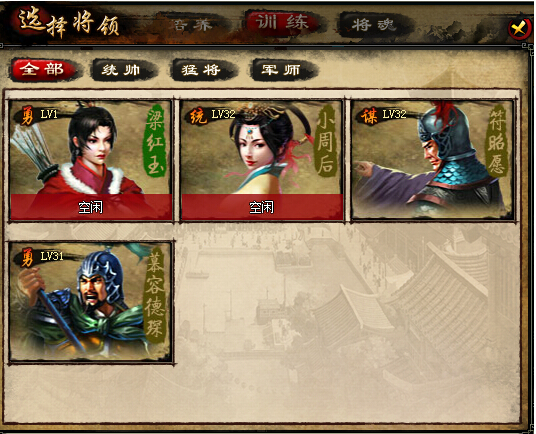 玩家打开将领训练界面,可以对自己的武将进行训练,训练能获得大量的经验。首先,点击选择将领,出现情况如下图