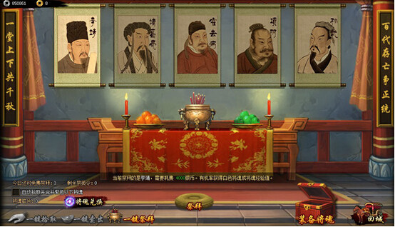 消耗一定的银币,就可以祭拜,祭拜之后可以获得将魂,也有概率获得的是败亡之魂,一共有五个英杰可以祭拜,祭拜从李靖开始,祭拜之后,有概率祭拜下面的英杰,等级越高的英杰,祭拜获得高品质的将魂的概率越大;祭拜孙武还有概率获得将魂碎片,将魂碎片可以用来兑换高品质将魂,如下图所示。