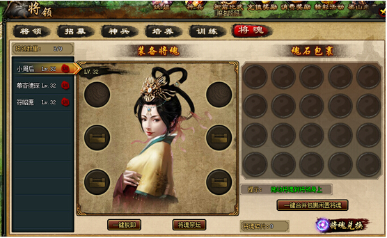 当武将等级达到20级时,方可以佩戴将魂,之后每十级解锁一个将魂,玩家可以装备将魂来提升玩家的战斗力,拖动将魂,就可以把将魂移动到将领身上,但需要注意的是,每个种类的将魂只能佩戴一个,不能重复带不同品质的将魂。