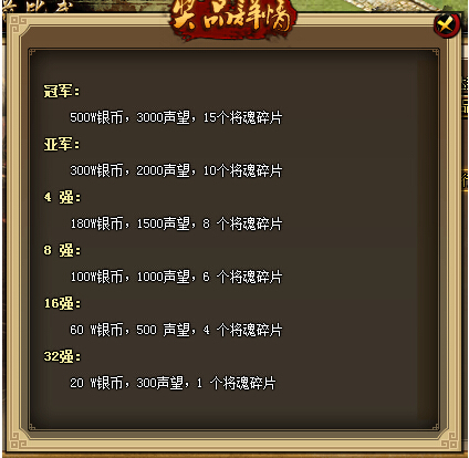 奖品:晋级32强的玩家都有奖励,玩家获得名次越靠前,奖励越丰厚。