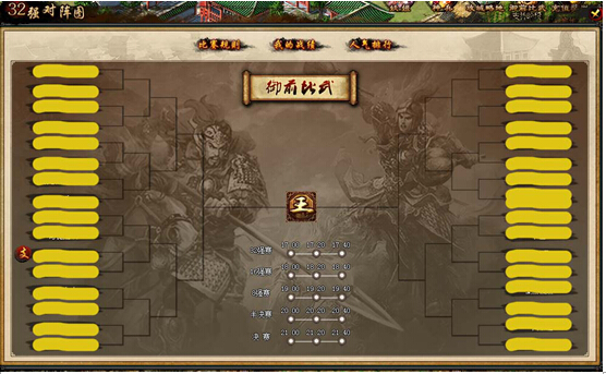 比赛采用三局两胜制,先获得两场胜利的玩家晋级下一轮,每场比赛间隔20分钟(例如:32强赛17点开始,17点20分进行第二场比赛,若前两场打成平局,将在17点40进行决胜局)间隔时间内,玩家可以自由调整军团配置(将领位置,兵种,武将技)。